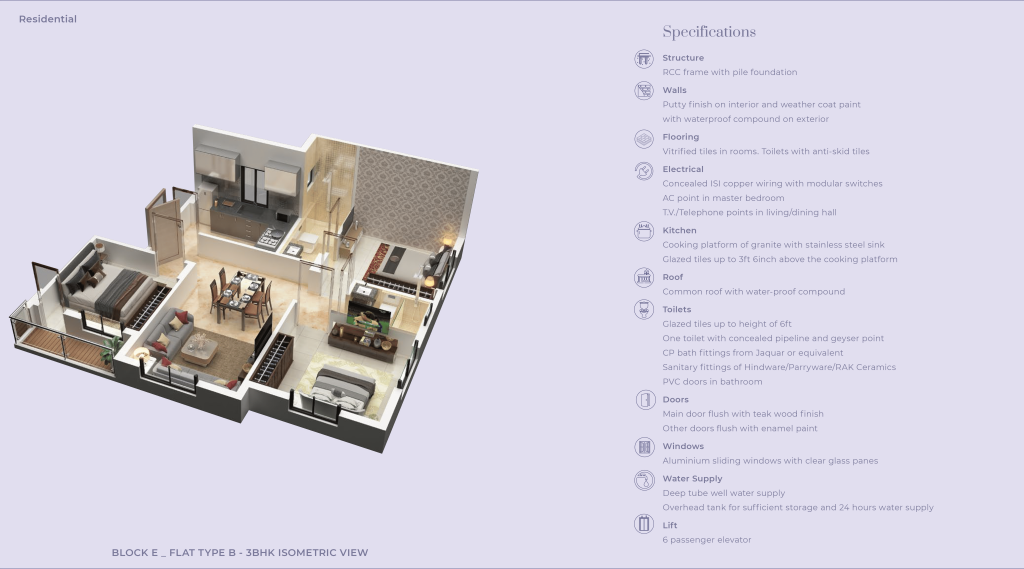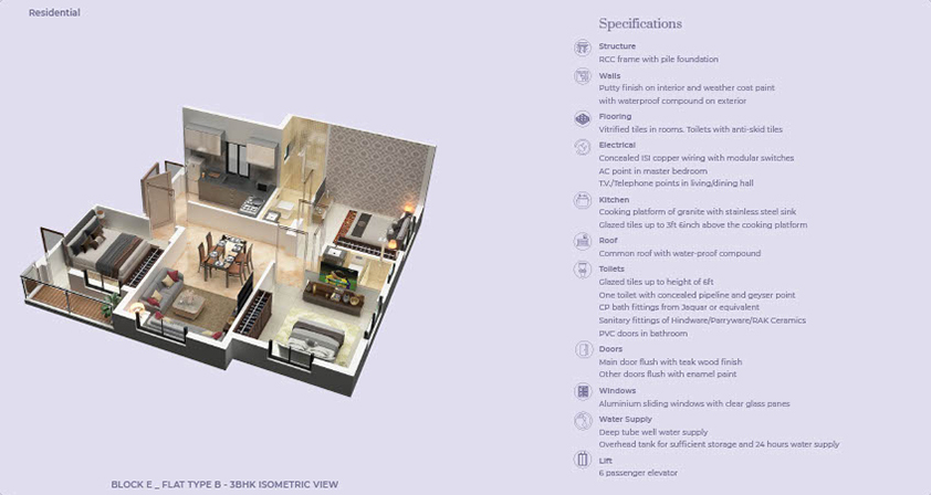 • Flooring: vitrified tiles in living, bedrooms; anti-skid tiles in bathrooms